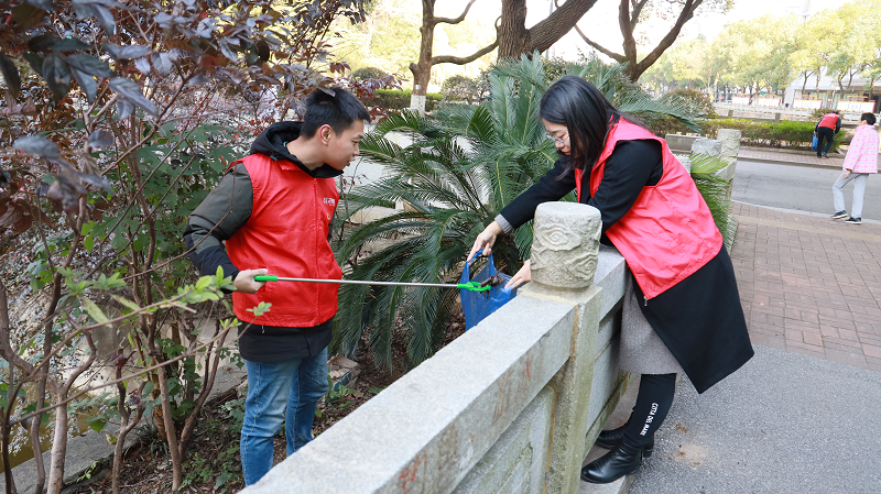 活動中,黨員志愿者們充分展現(xiàn)了不怕臟、不怕苦、不怕累,敢于沖在前面、敢于搶挑重擔的精神風貌。向陽湖內(nèi)側(cè)綠化帶因有石板護欄隔離,存在多處衛(wèi)生死角,清理垃圾非常不便。年輕黨員志愿者主動認領(lǐng)任務(wù),迅速組團配對,有的爬過護欄跳入綠化帶內(nèi)進行清理,有的在旁傳遞垃圾袋,有的一手提著垃圾袋,一手拿著垃圾夾子,對蓉園路沿線及南海賓館前坪的塑料袋、煙蒂、電池、玻璃瓶等不易降解的有毒有害垃圾進行清理。